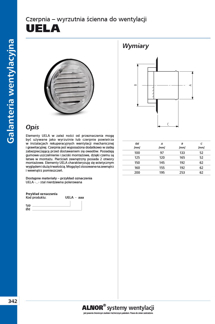 Czerpnia wyrzutnia ścienna UELA fi 200 nierdzewna