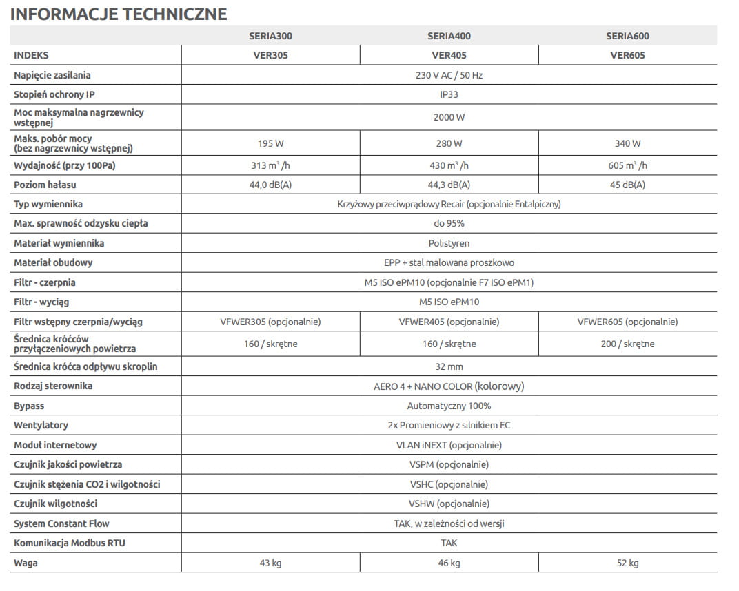 - Typ wymiennika: Krzyżowy przeciwprądowy Recair (opcjonalnie Entalpiczny)