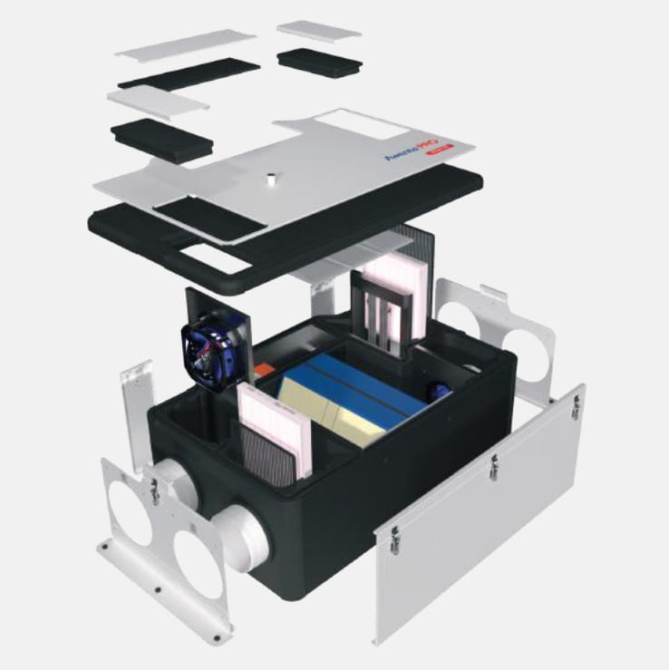- Wymiennik przeciw wymiennik przeciwprądowy o sprawności do 95% oraz oszczędne wentylatory z silnikami EC Ziehl-Abegg i EBM papst.