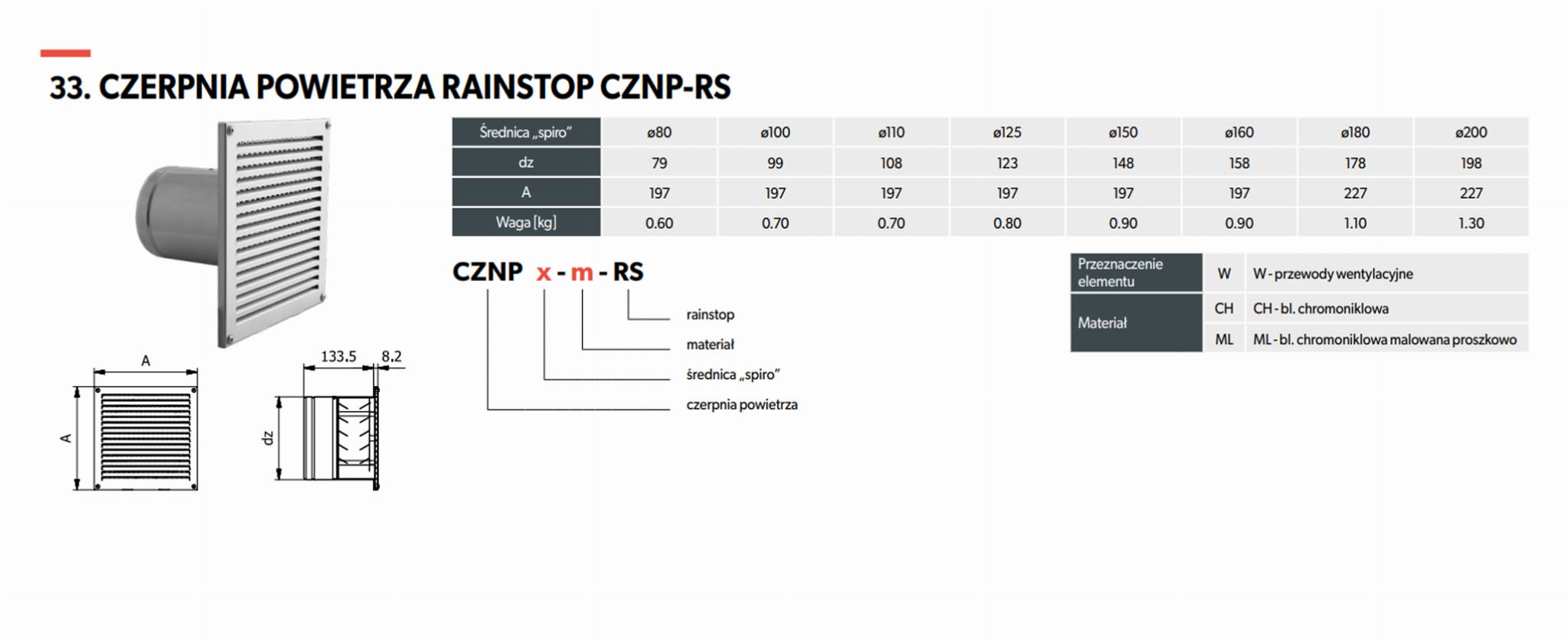 Specjalnie zaprojektowane lamele czepni chronią wnętrze kanału wentylacyjnego przed wody opadową.