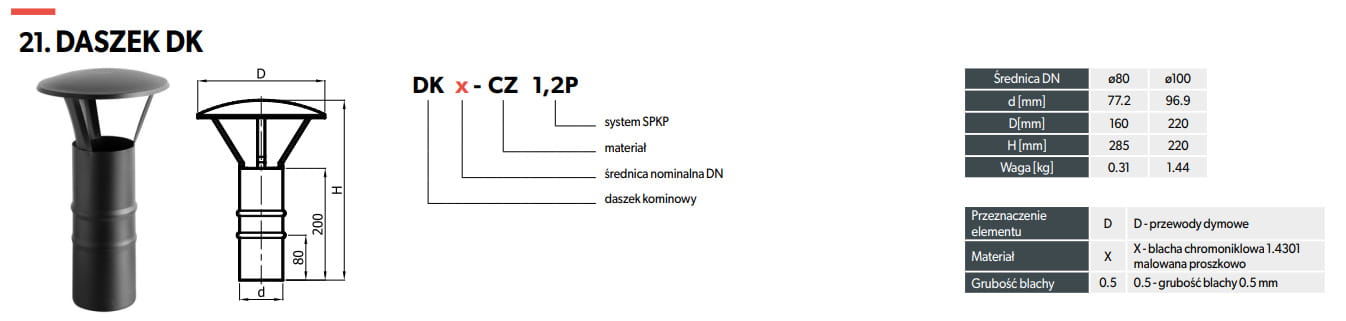 Zadaniem daszka jest zabezpieczenie przewodu odprowadzającego spaliny przed opadami deszczu, wykonany w całości ze stali czarnej.