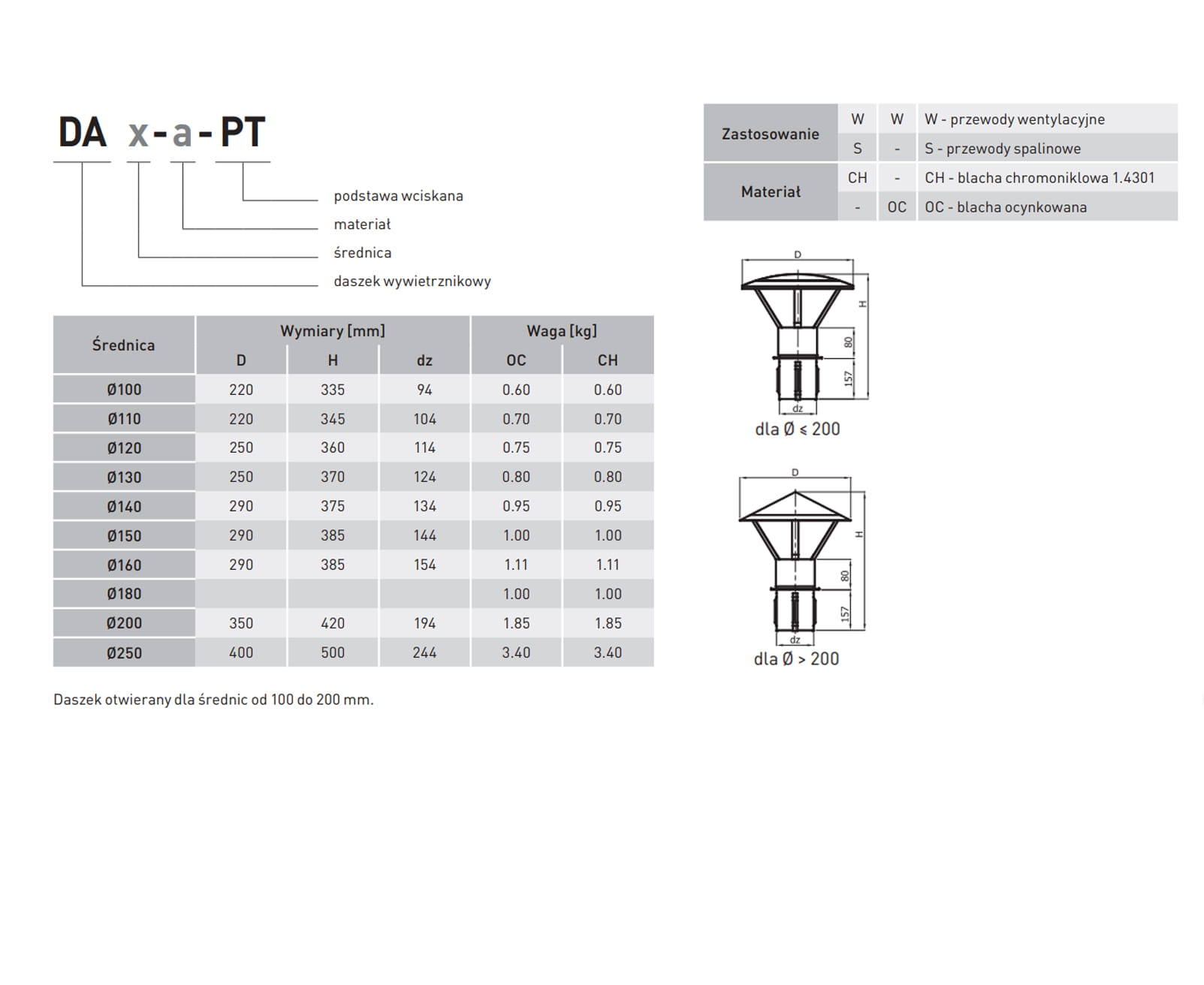 Daszek kominowy wykonany z blachy ocynkowane przeznaczony jest do zabudowy wylotów przewodów kominowych wentylacyjnych o działaniu grawitacyjnym.