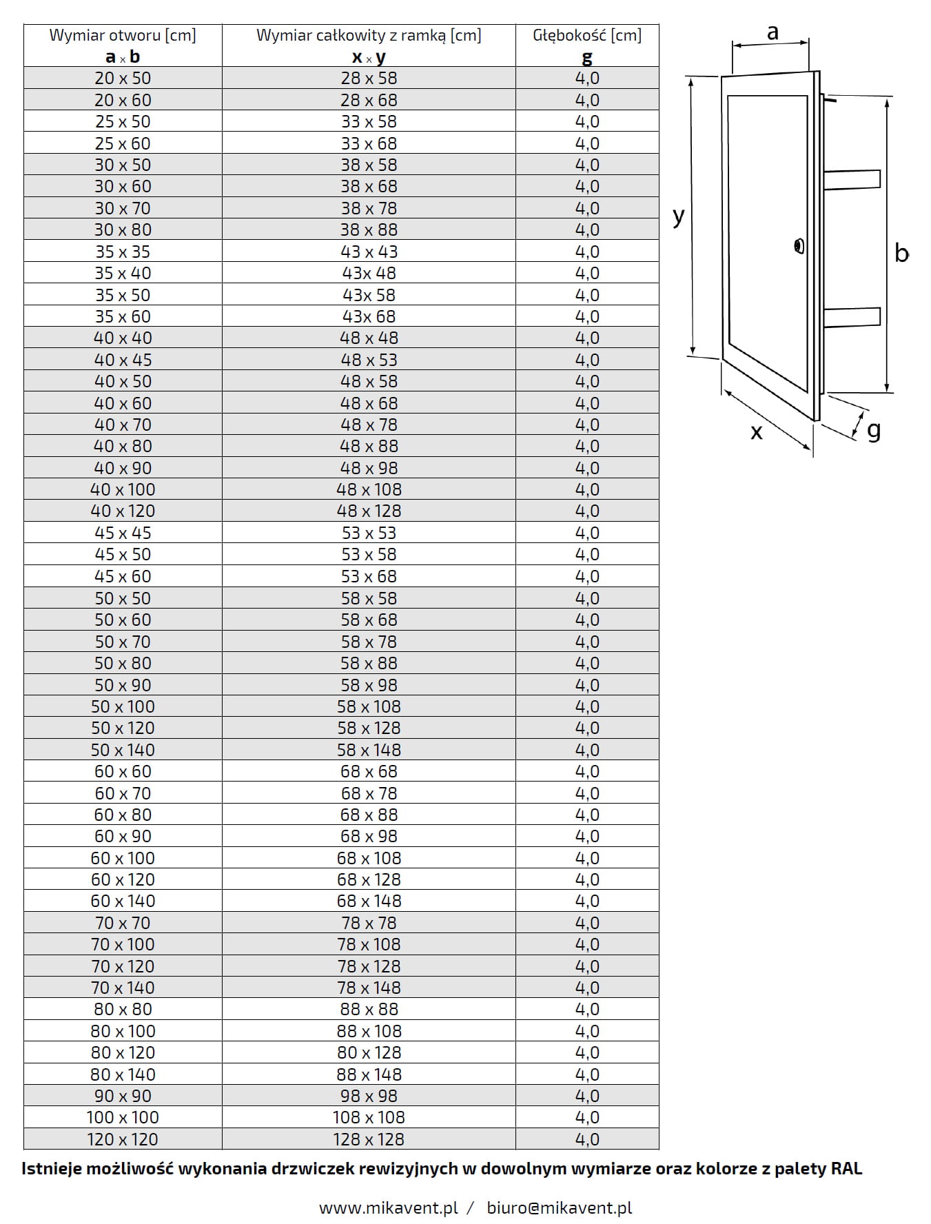 Istnieje możliwość wykonania drzwiczek w dowolnym rozmiarze i kolorze z palety RAL.
