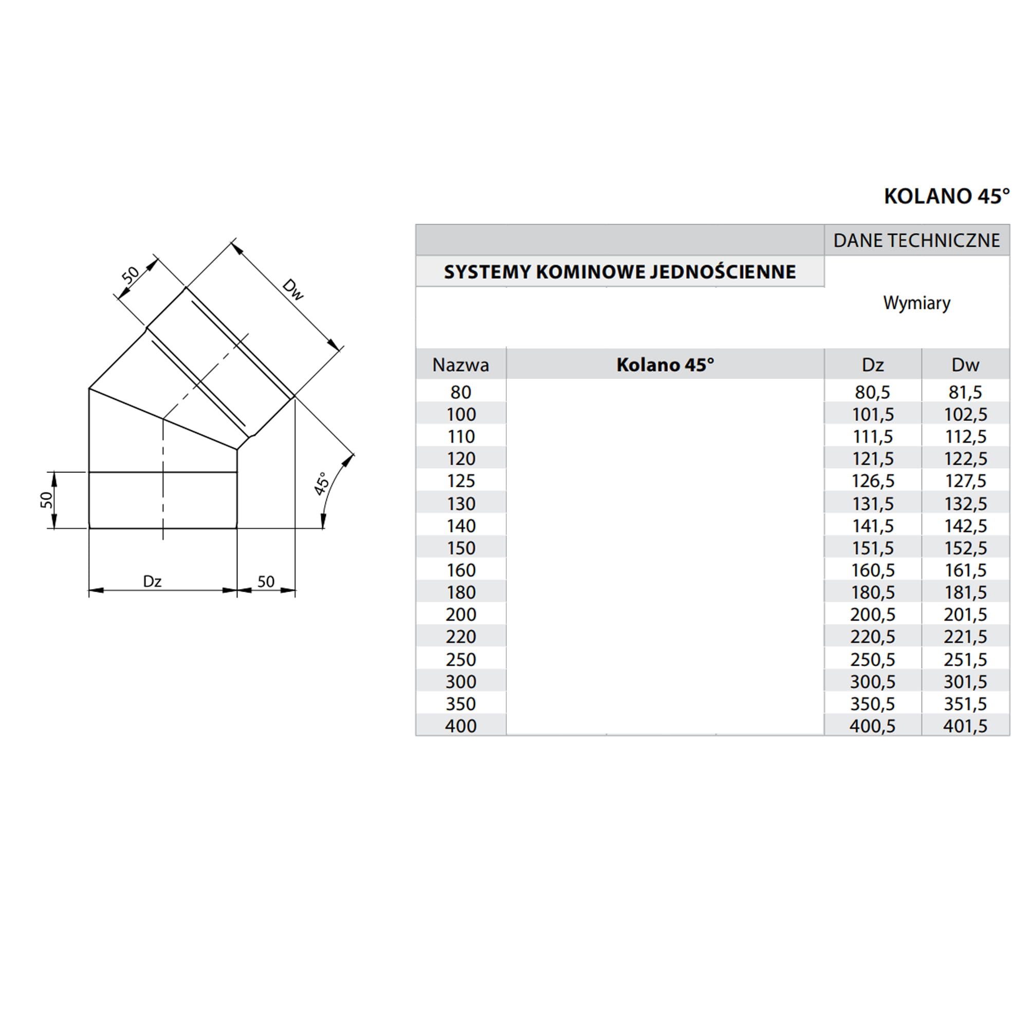 Kolano kominowe wykonane z blachy żaroodpornej przeznaczone jest do podłączenia pieca opalanego gazem, olejem opałowym, drewnem, ekologicznym paliwem stałym oraz węglem z wkładem kominowym pod kątem 45°.