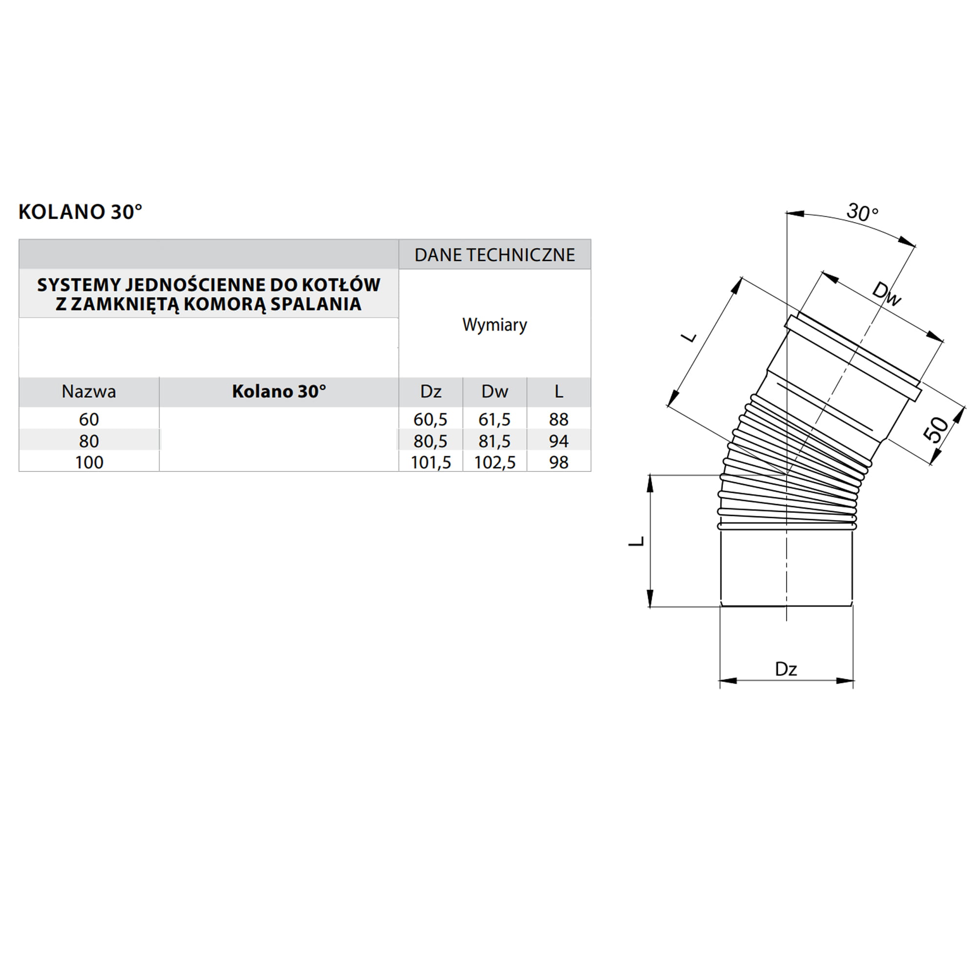 Kolano kominowe wykonane z blachy kwasoodpornej przeznaczone jest do podłączenia pieca opalanego gazem lub olejem opałowym z wkładem kominowym pod kątem 30°.