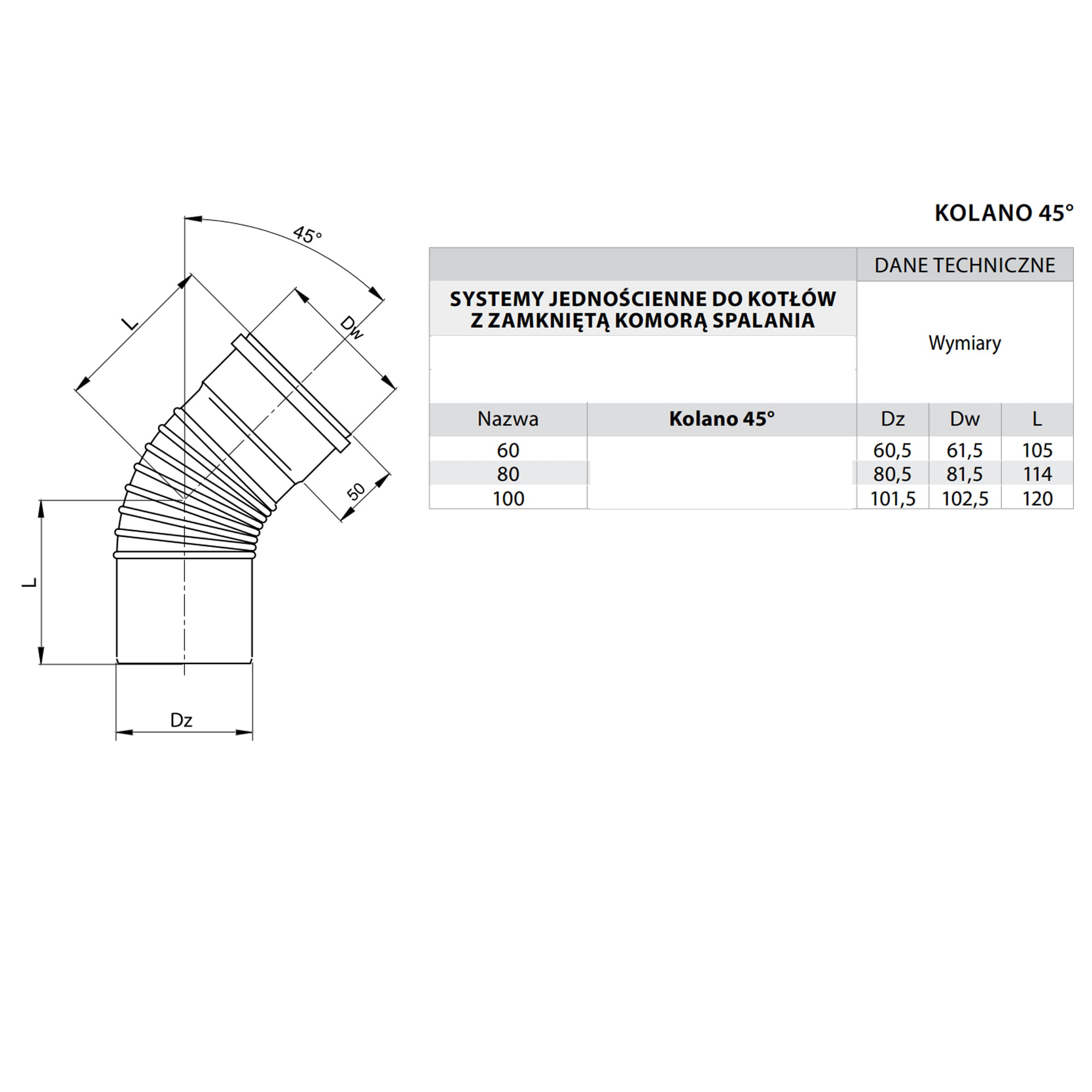 Kolano kominowe wykonane z blachy kwasoodpornej przeznaczone jest do podłączenia pieca opalanego gazem lub olejem opałowym z wkładem kominowym pod kątem 45°.