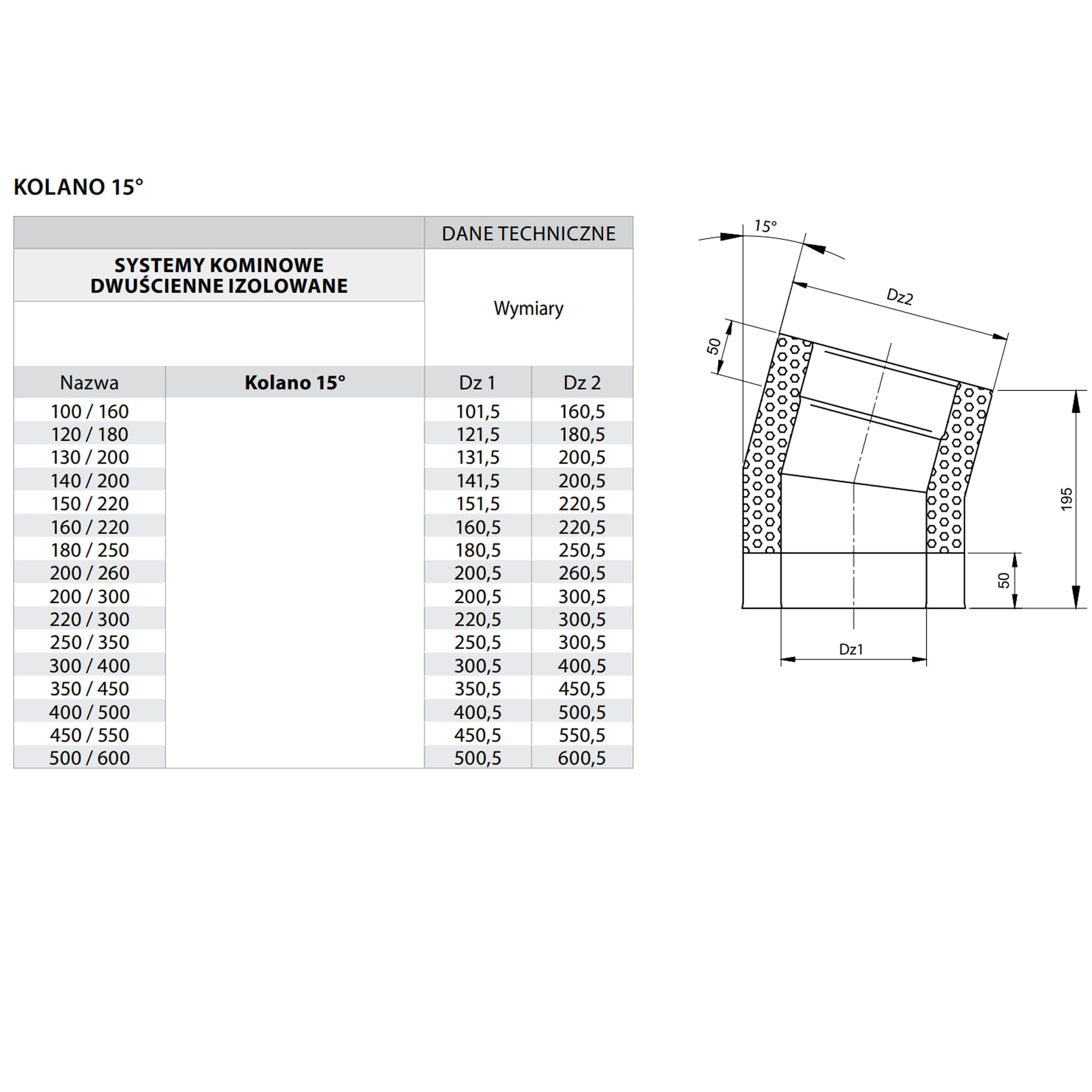 Kolano kominowe izolowane wykonane z blachy kwasoodpornej przeznaczone jest do połączenia pieca z otwartą komorą spalania opalanego gazem lub olejem opałowym z kominem izolowanym pod kątem 15°.