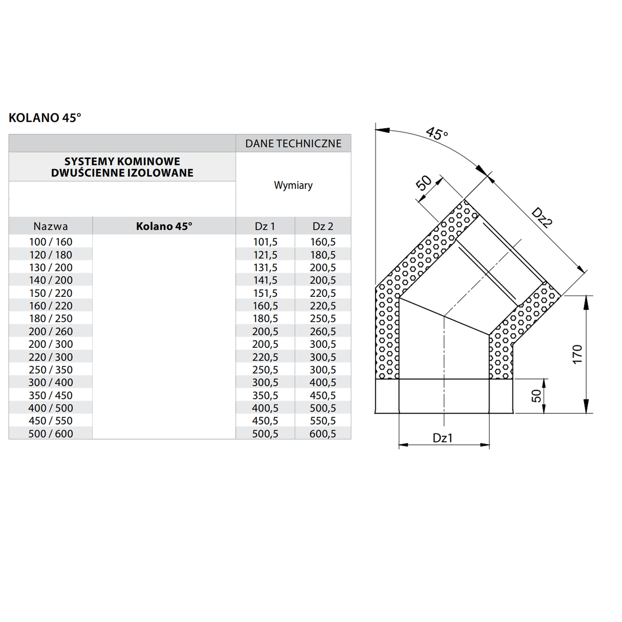Kolano kominowe izolowane wykonane z blachy kwasoodpornej przeznaczone jest do połączenia pieca z otwartą komorą spalania opalanego gazem lub olejem opałowym z kominem izolowanym pod kątem 45°.