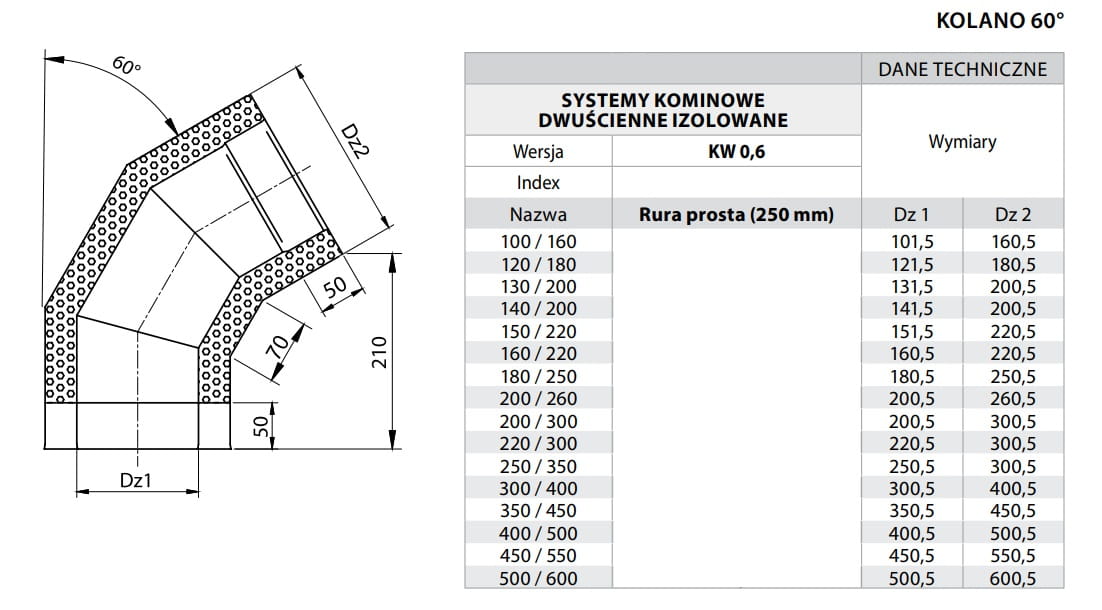 Kolano kominowe izolowane wykonane z blachy kwasoodpornej przeznaczone jest do połączenia pieca z otwartą komorą spalania opalanego gazem lub olejem opałowym z kominem izolowanym pod kątem 60°.