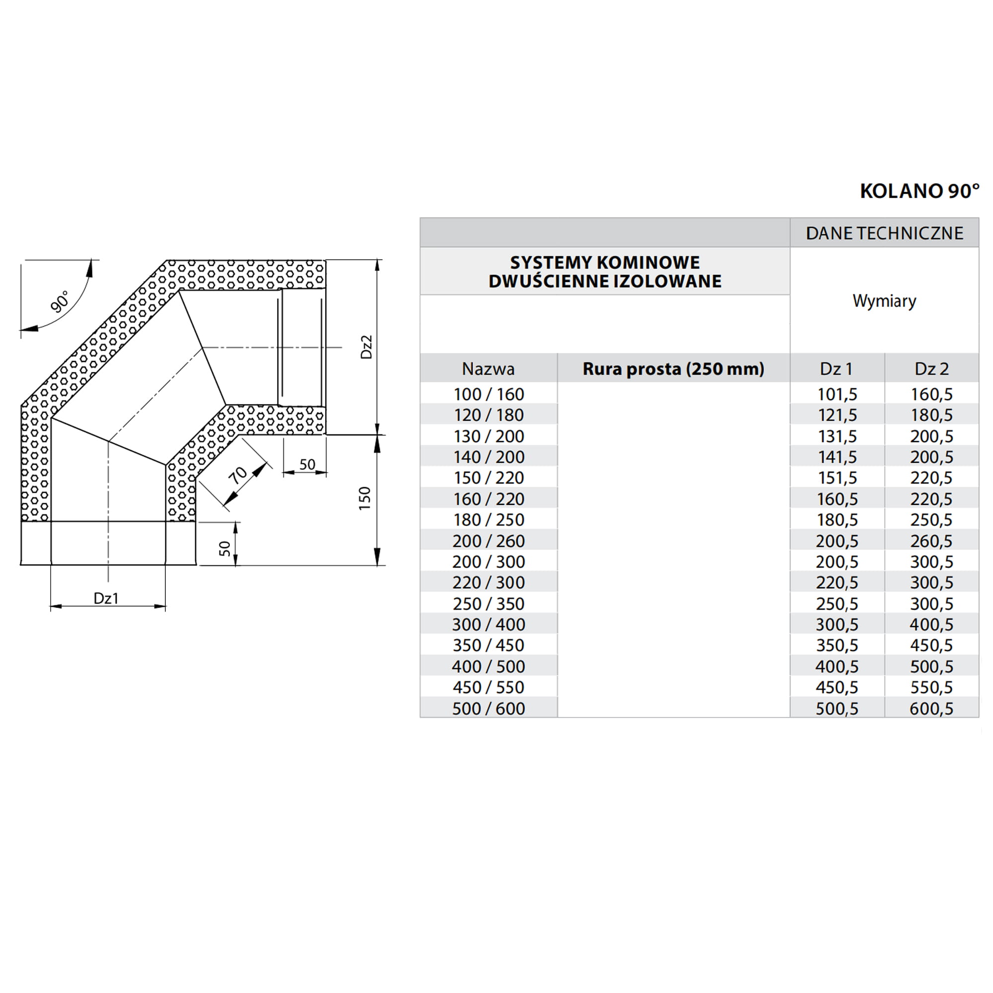 Kolano kominowe izolowane wykonane z blachy kwasoodpornej przeznaczone jest do połączenia pieca z otwartą komorą spalania opalanego gazem lub olejem opałowym z kominem izolowanym pod kątem 90°.