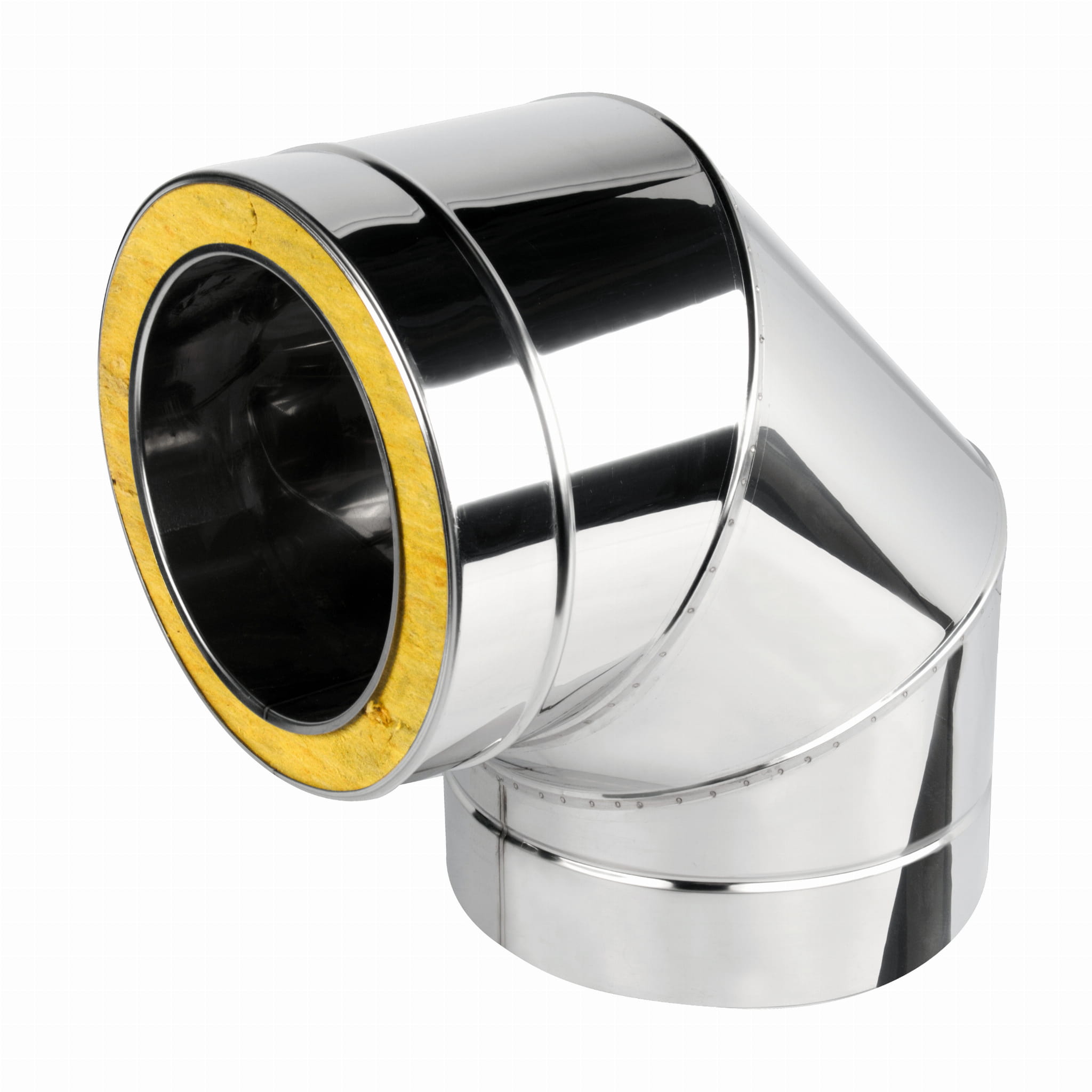 Kolano kominowe izolowane wykonane z blachy kwasoodpornej przeznaczone jest do połączenia pieca z otwartą komorą spalania opalanego gazem lub olejem opałowym z kominem izolowanym pod kątem 90°.