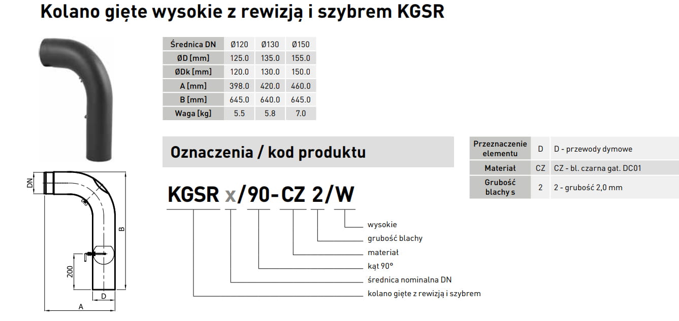 Kolano spalinowe gięte fi 150 wysokie / z szybrem / z rewizją Darco SPK