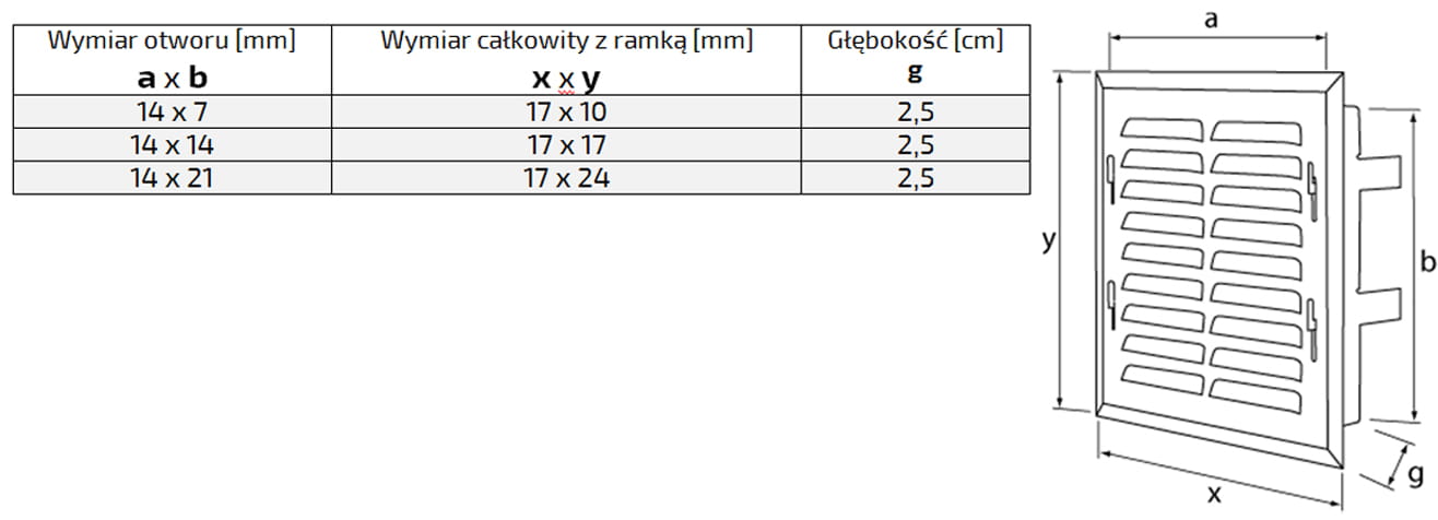 - Wymiar otworu: 14 szer. x 21 wys. [cm]