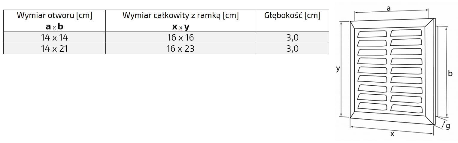 - Wymiar otworu: 14 szer. x 21 wys. [cm]