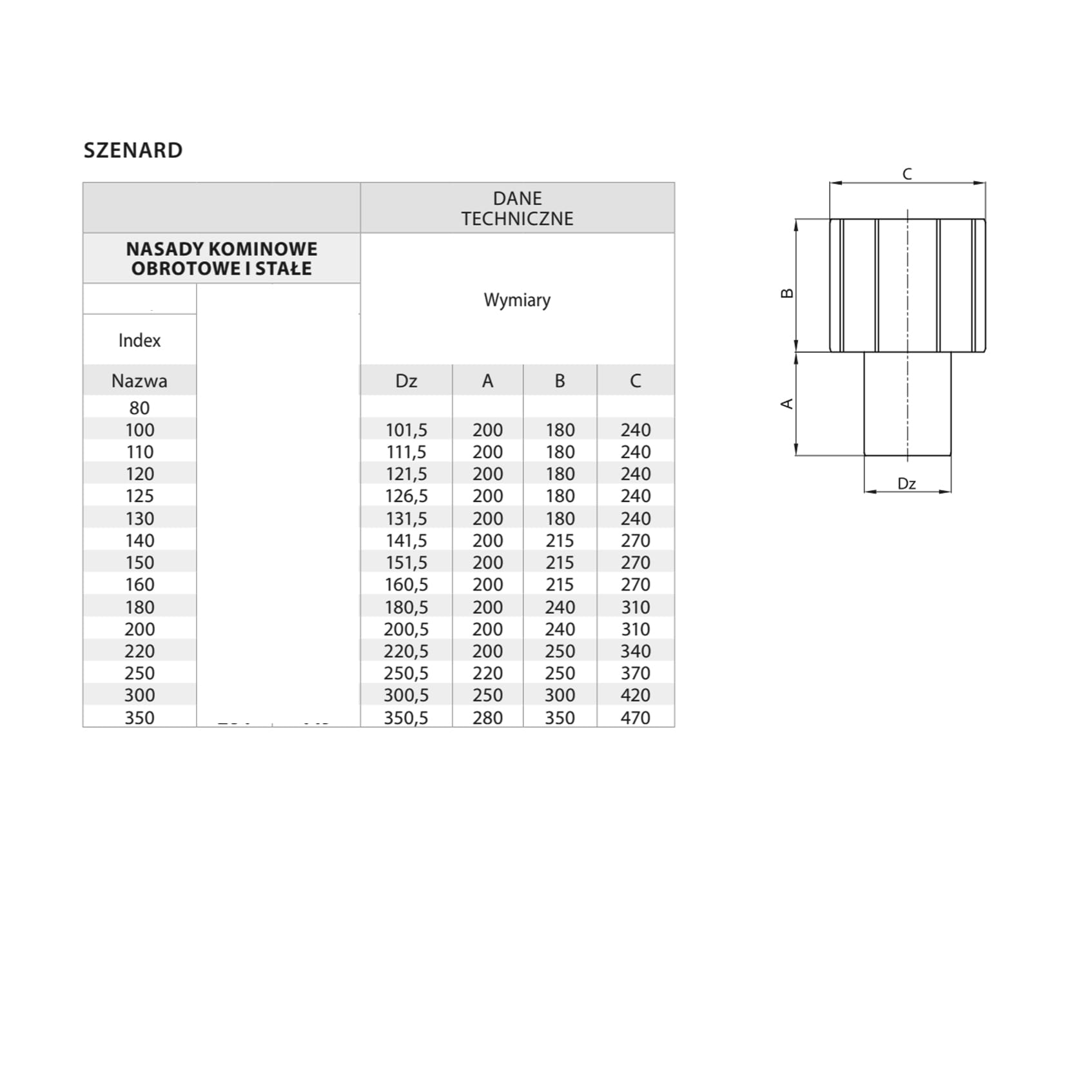 Nasada kominowa typu Szenard wykonana z blachy kwasoodpornej przeznaczona jest do zabezpieczenia wewnętrznej części komina, poprawy siły ciągu i zapobieganiu cofania się powietrza do przewodu kominowego wentylacyjnego.