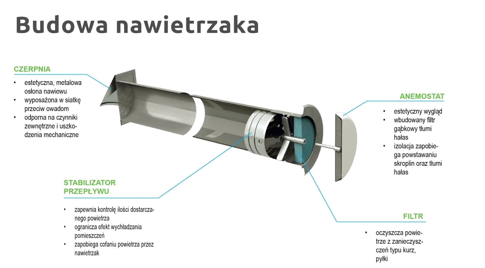 Nawietrzak jest wyposażony w czerpnię powietrza, która jest odpowiedzialna za pobór powietrza z zewnątrz, dodatkowo posiada wkładkę akustyczną.
