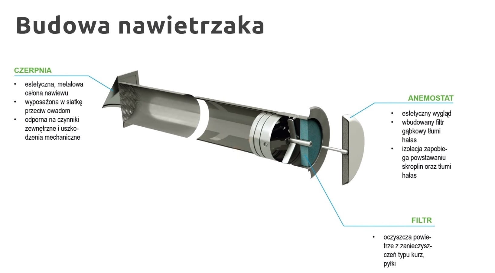 Nawietrzak jest wyposażony w czerpnię powietrza, która jest odpowiedzialna za pobór powietrza z zewnątrz.