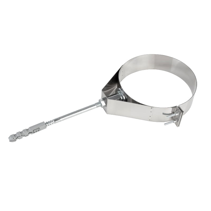 Obejma wzmacniająca wykonana z blachy kwasoodpornej przeznaczona jest do montażu komina na ścianie.