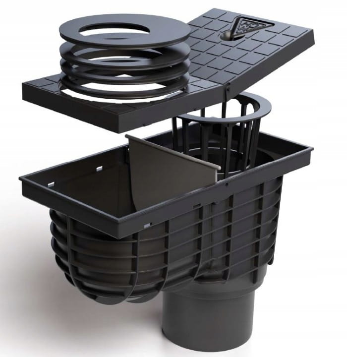 Zastosowanie dolnego odpływu oraz dołączonego pierścienia redukcyjnego umożliwia precyzyjne dopasowanie osadnika do różnych średnic rur spustowych oraz systemów kanalizacji deszczowej. Przemyślana konstrukcja ułatwia montaż oraz zapewnia wygodną eksploatację i łatwy dostęp do elementów wymagających okresowego czyszczenia.