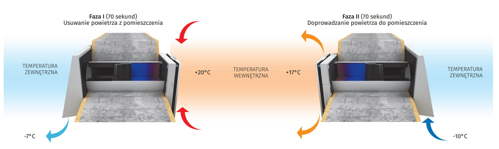 Zanieczyszczone, ciepłe powietrze usuwane z pomieszczenia na zewnątrz przechodzi przez wymiennik ciepła, stopniowo go nagrzewając i oddając część wilgoci. Po nagrzaniu się ceramicznego wymiennika urządzenie automatycznie przełącza się na tryb pobierania powietrza.