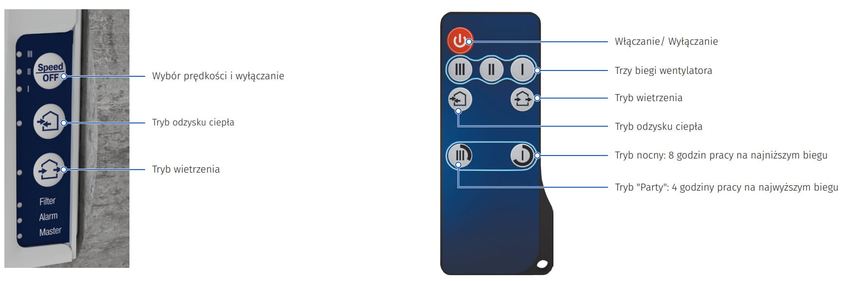 Sterowanie urządzeniem odbywa się za pomocą przycisków umieszczonych na obudowie lub pilota który znajduje się w zestawie.