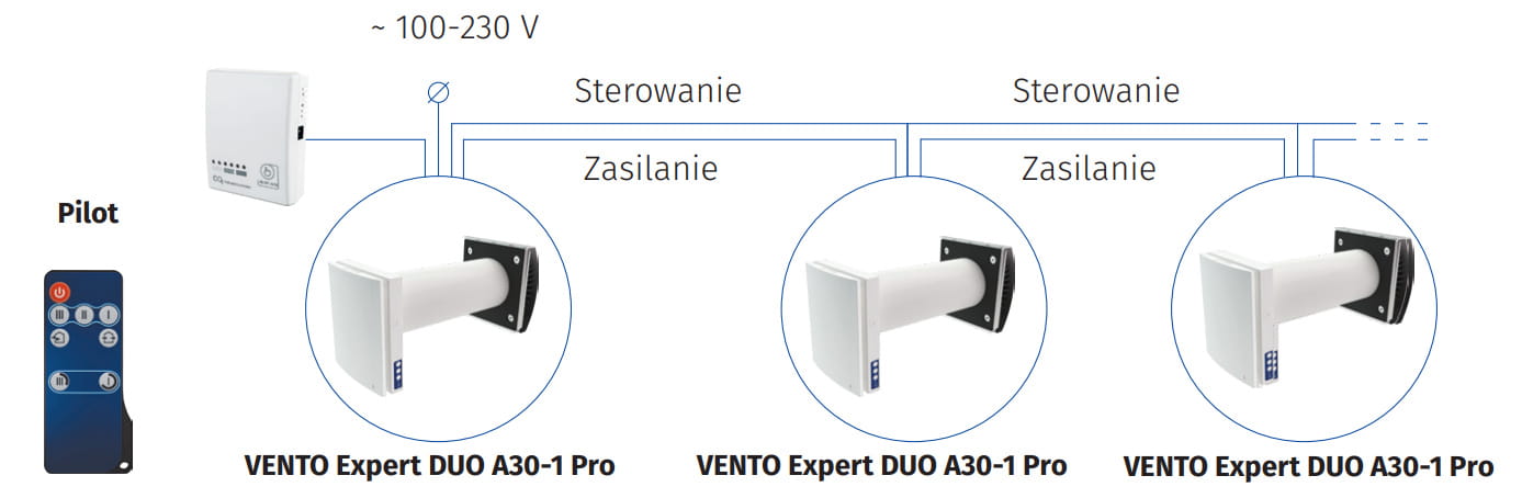 Vento Expert Duo może działać jako samodzielna jednostka lub może być połączona z innymi urządzeniami w domu sterowanymi z jednostki głównej. W tym przypadku, tylko jedna jednostka główna odbiera sygnał ze zdalnego sterowania. Vento Expert Duo jest wyposażone w higrostat do kontroli wilgotności w pomieszczeniach. Jeżeli wilgotność powietrza przekroczy wielkość zadaną to urządzenie przełączy się na najwyższe obroty niezależnie od innych jednostek w systemie.
