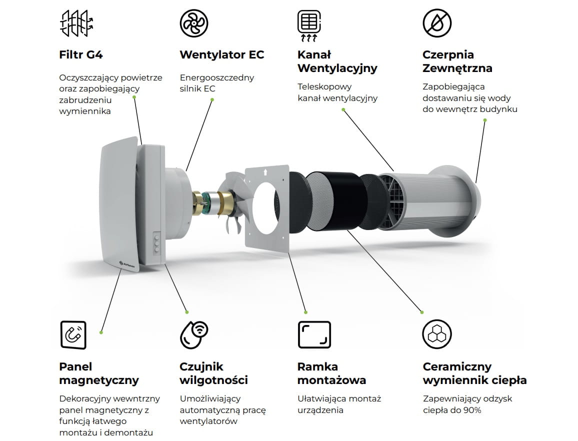 Rekuperator AirSaver to kompaktowe urządzenie wentylacyjne z odzyskiem ciepła montowane w ścianie budynku. Oferowane urządzenie wyposażona jest w ceramiczny wymiennik, wentylator energooszczędny EC oraz filtry powietrza G4, dodatkowo posiada wtyczkę zasilania która ułatwia samodzielny montaż.