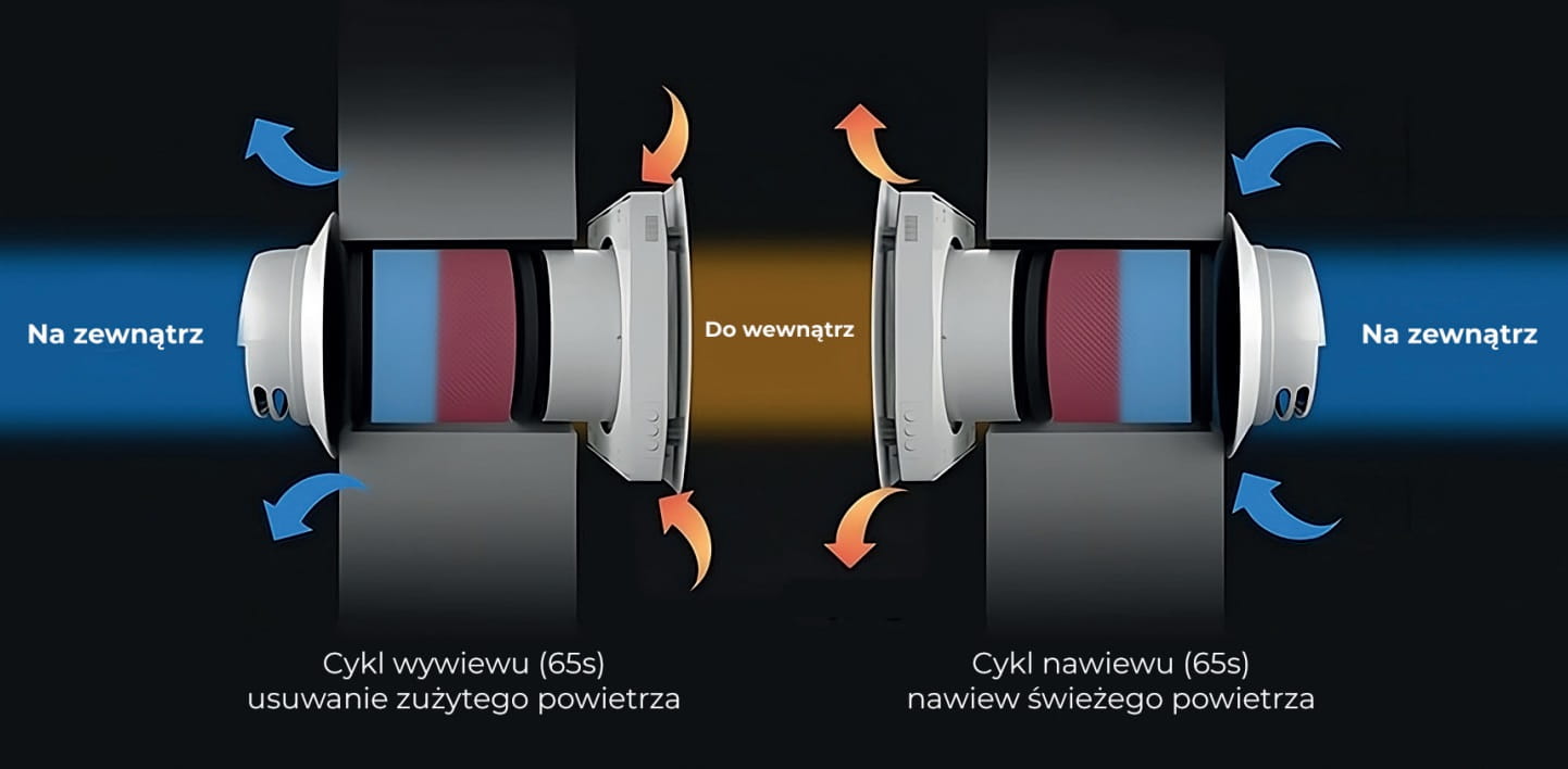 Ciepłe, zużyte powietrze usuwane z pomieszczenia przepływa przez wymiennik ciepła, przekazując ciepło i wilgoć. Po 60 sekundach nagrzewania wymiennika ciepła, jednostka wentylacyjna przełącza się w tryb nawiewu.