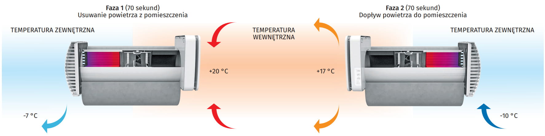 Świeże, chłodne powietrze nawiewane przepływa przez wymiennik ciepła i pochłania nagromadzone w nim ciepło i wilgoć. Po schłodzeniu wymiennika ciepła urządzenie przełącza się w tryb wyciągu powietrza.