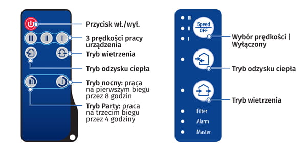Możliwość włączenia/wyłączenia, wybór prędkości pracy urządzenia, włączenia trybu wietrzenia, odzysku ciepła, nocnego oraz party.