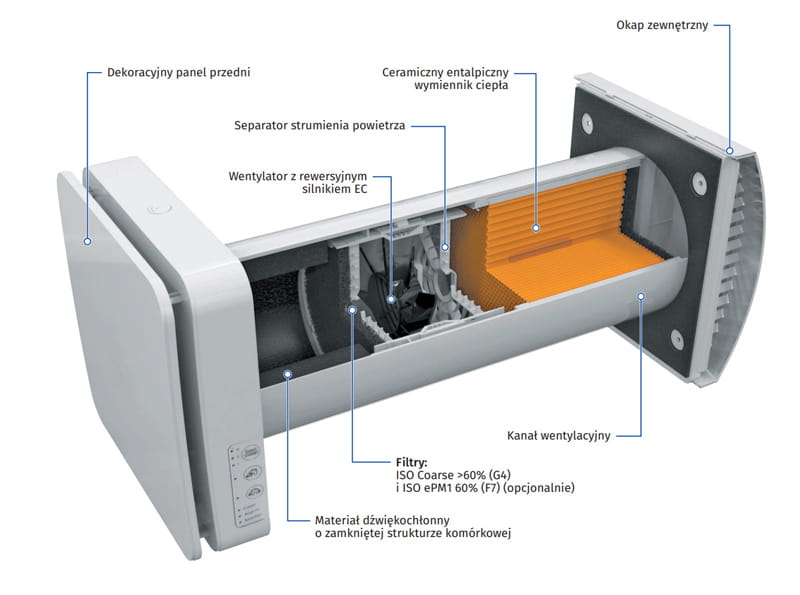 Oferowany rekuperator ścienny wyposażony jest w ceramiczny entalpiczny wymiennik ciepła, którego zadaniem jest gromadzenie i oddawanie (rekuperacja) energii cieplnej w procesie wywiewu i nawiewu powietrza z pomieszczenia, w którym jest zainstalowany.