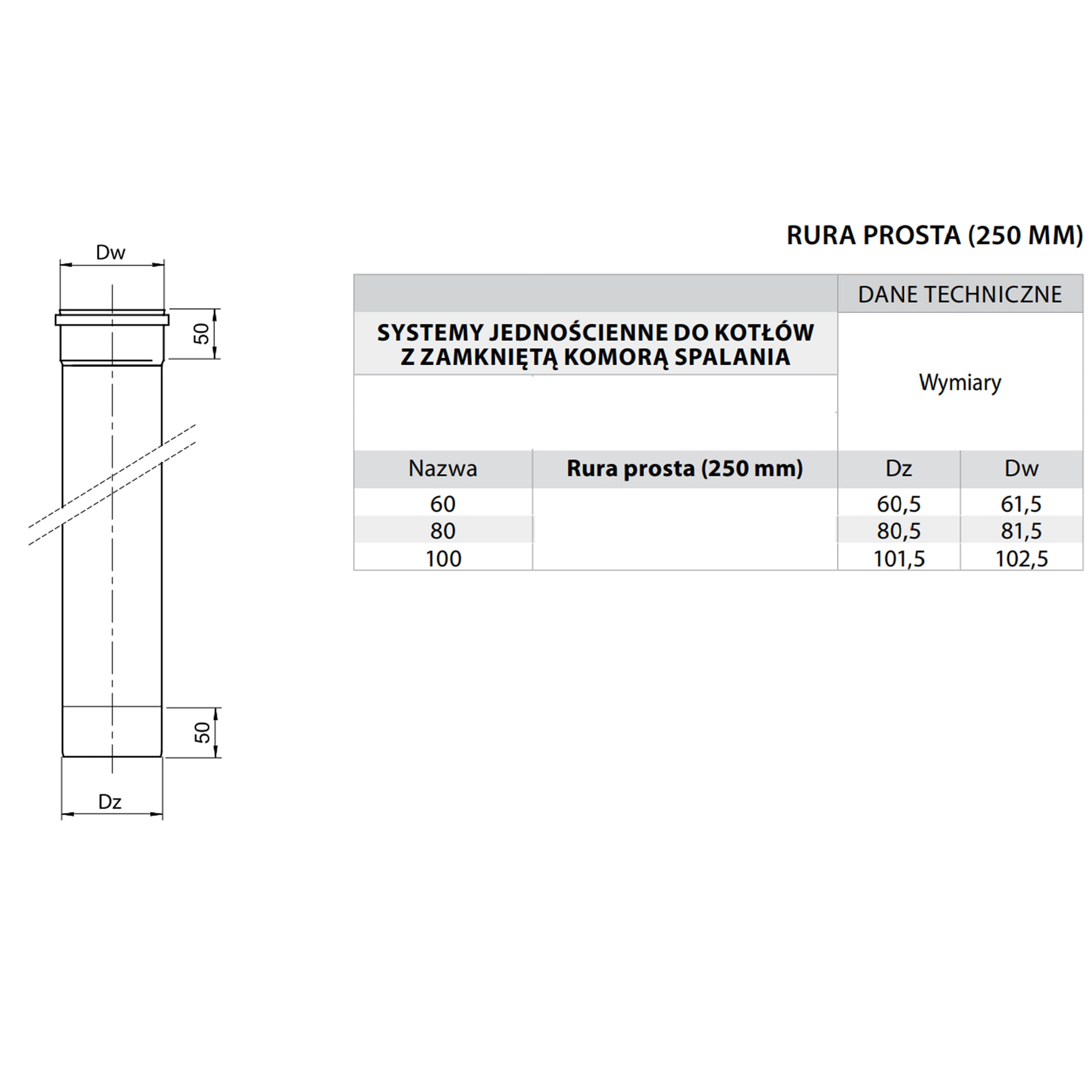Rura prosta wykonana z blachy kwasoodpornej przeznaczona jest do budowy prostych odcinków wkładu kominowego o żądanej długości do urządzeń grzewczych z zamkniętą komorą spalania oraz kondensacyjnych opalanych gazem lub olejem opałowym.