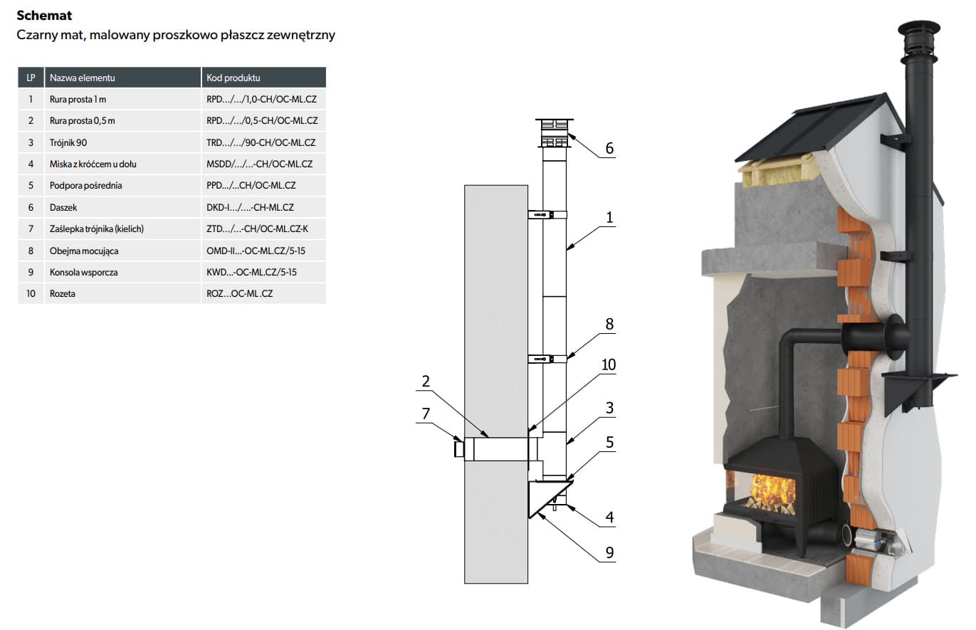 Płaszcz zewnętrzny wykonany jest z blachy ocynkowanej malowanej proszkowo na czarno w kolorze RAL 9005, co pozwala idealnie dopasować komin do estetyki budynku.