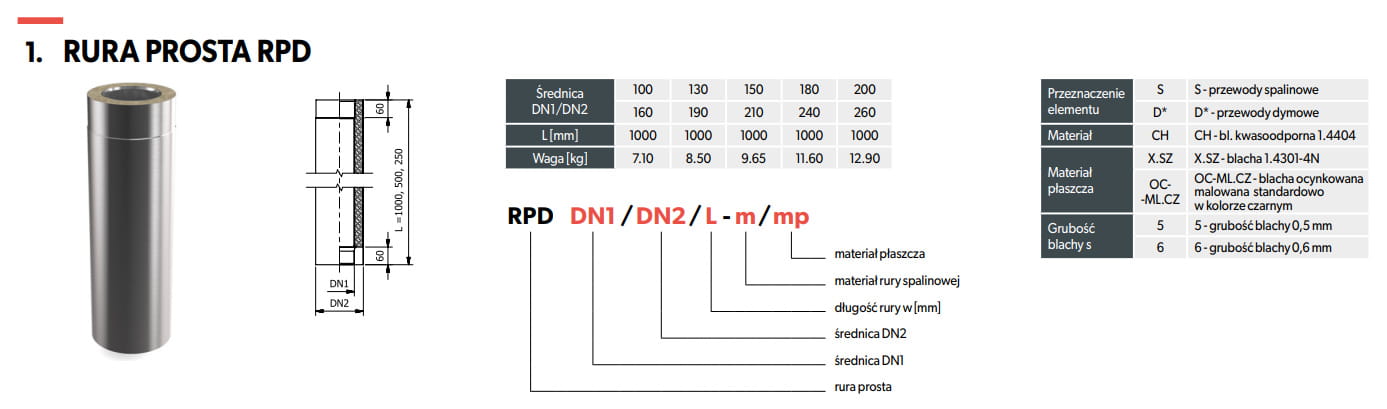 Rura prosta dwuścienna fi 100/160 1 m kwasoodporna, malowana w kolorze czarnym