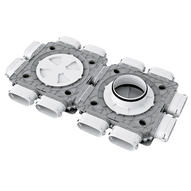 Skrzynki rozdzielcze FlexiVent służą do rozprowadzenia powietrza nawiewanego lub zebrania powietrza zużytego z pomieszczeń podłączonych do systemu rekuperacji i są bezpośrednio podłączone do centrali wentylacyjnej, wykonane zostały z wysokiej jakości tworzywa sztucznego polipropylen PP z elastomerem termoplastycznym SEBS.