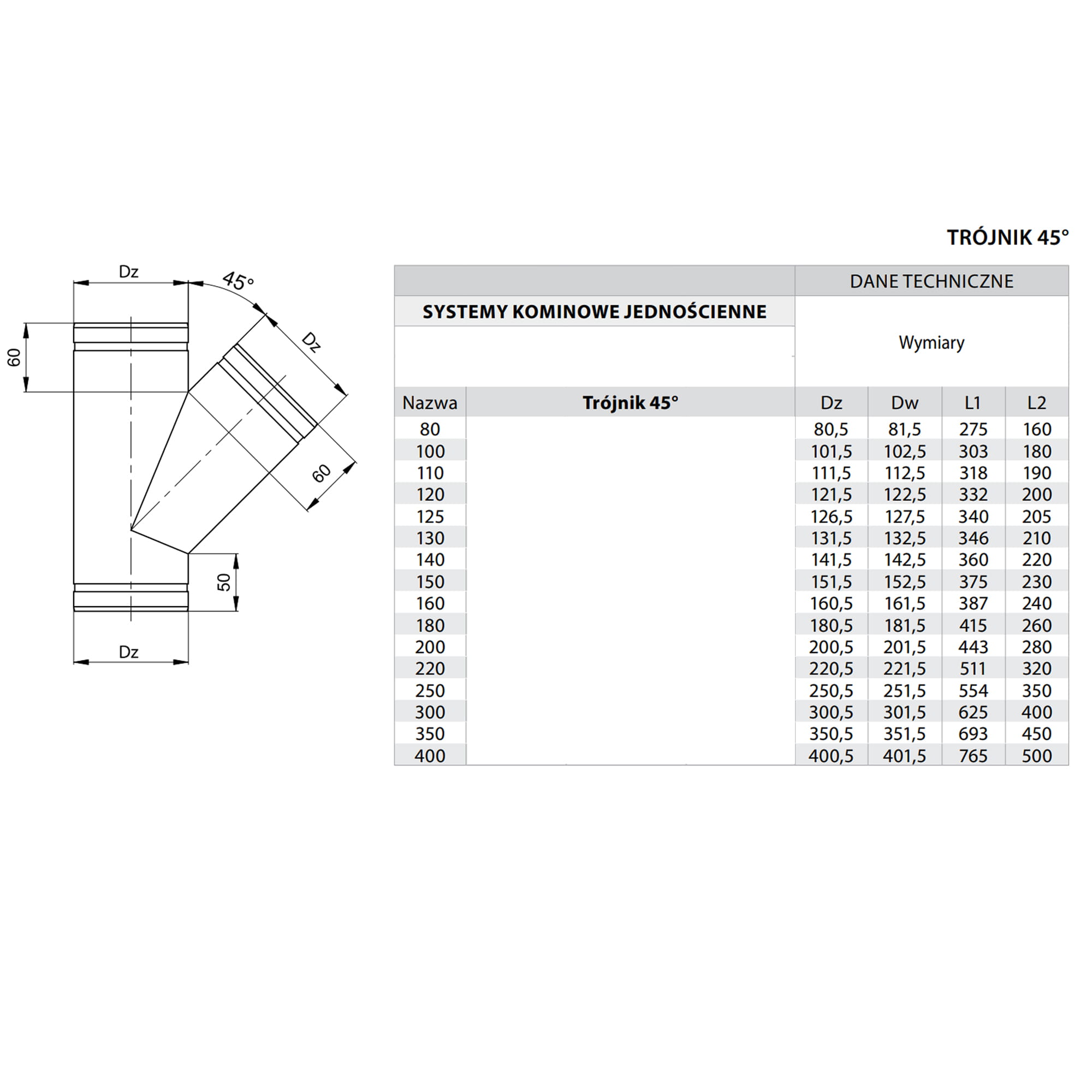 Trójnik kominowy wykonany z blachy kwasoodpornej przeznaczony jest do podłączenia pieca opalanego gazem lub olejem opałowym z wkładem kominowym pod kątem 45°.