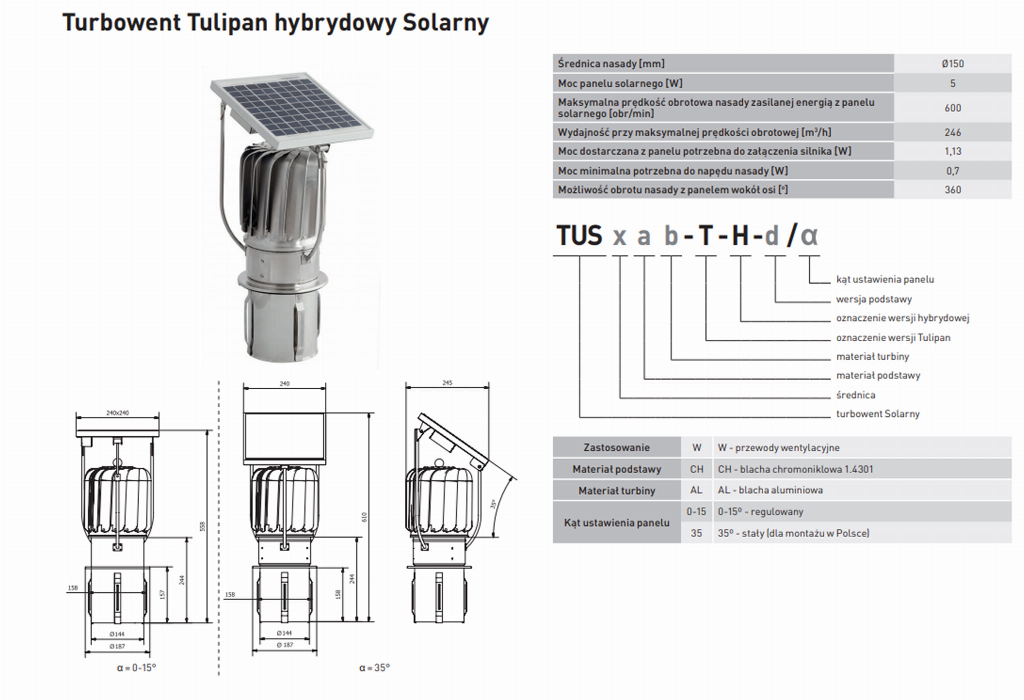 Turbowent hybrydowy solarny Darco fi 150 0-15° TUS150CHAL-T-H-PT/0-15