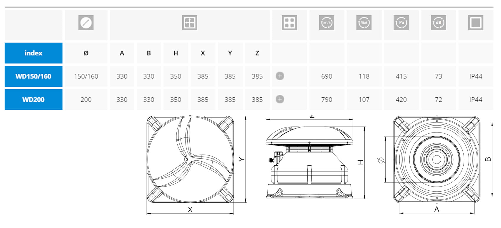 Wentylatory serii WD przeznaczone są do użytkowania na powierzchniach dachowych, jak również na kominach wentylacyjnych.