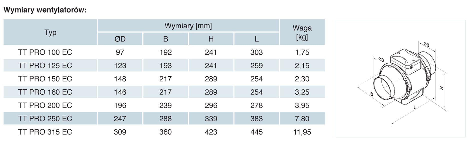 Wentylatory kanałowe o przepływie mieszanym serii TT PRO wykorzystywane są w nawiewno-wywiewnych systemach wentylacji, które wymagają stosunkowo wysokiego sprężu, silnego strumienia powietrza oraz niskiego poziomu hałasu. Zastosowanie silników EC redukuje zużycie energii o 35%. Wentylatory przystosowane są do transportu powietrza o temperaturze +55°C.