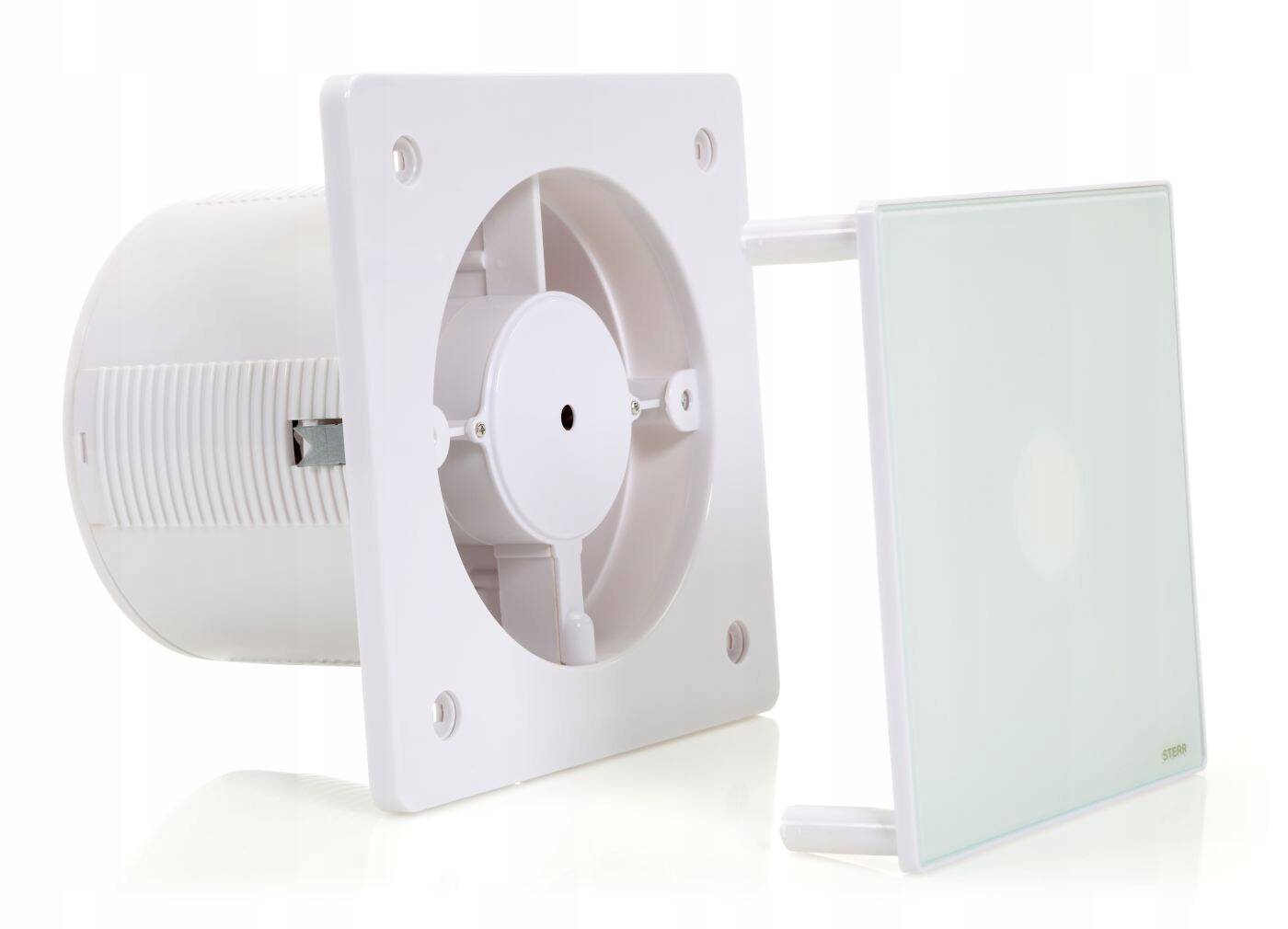 Wentylator łazienkowy Sterr posiada szklany panelem frontowym, idealny do nowoczesnych wnętrz.