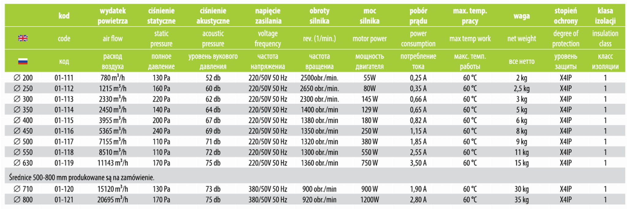 Wentylatory wyposażone są w jednofazowe silniki asynchroniczne na łożyskach kulowych, silnik został dodatkowo zabezpieczony bezpiecznikiem termicznym.