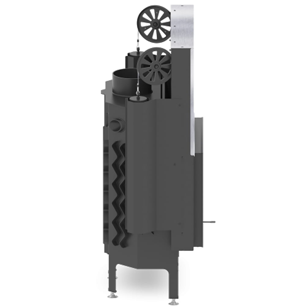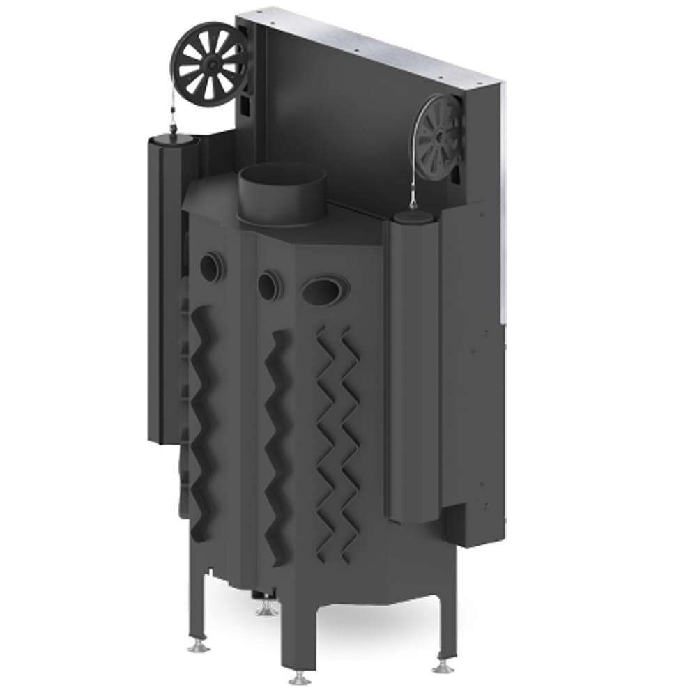 - Specjalnie zaprojektowana tylna część korpusu umożliwia doprowadzenie powietrza wtórnego do górnej części paleniska. Umożliwia podniesienie sprawności urządzenia poprzez dopalanie spalin.