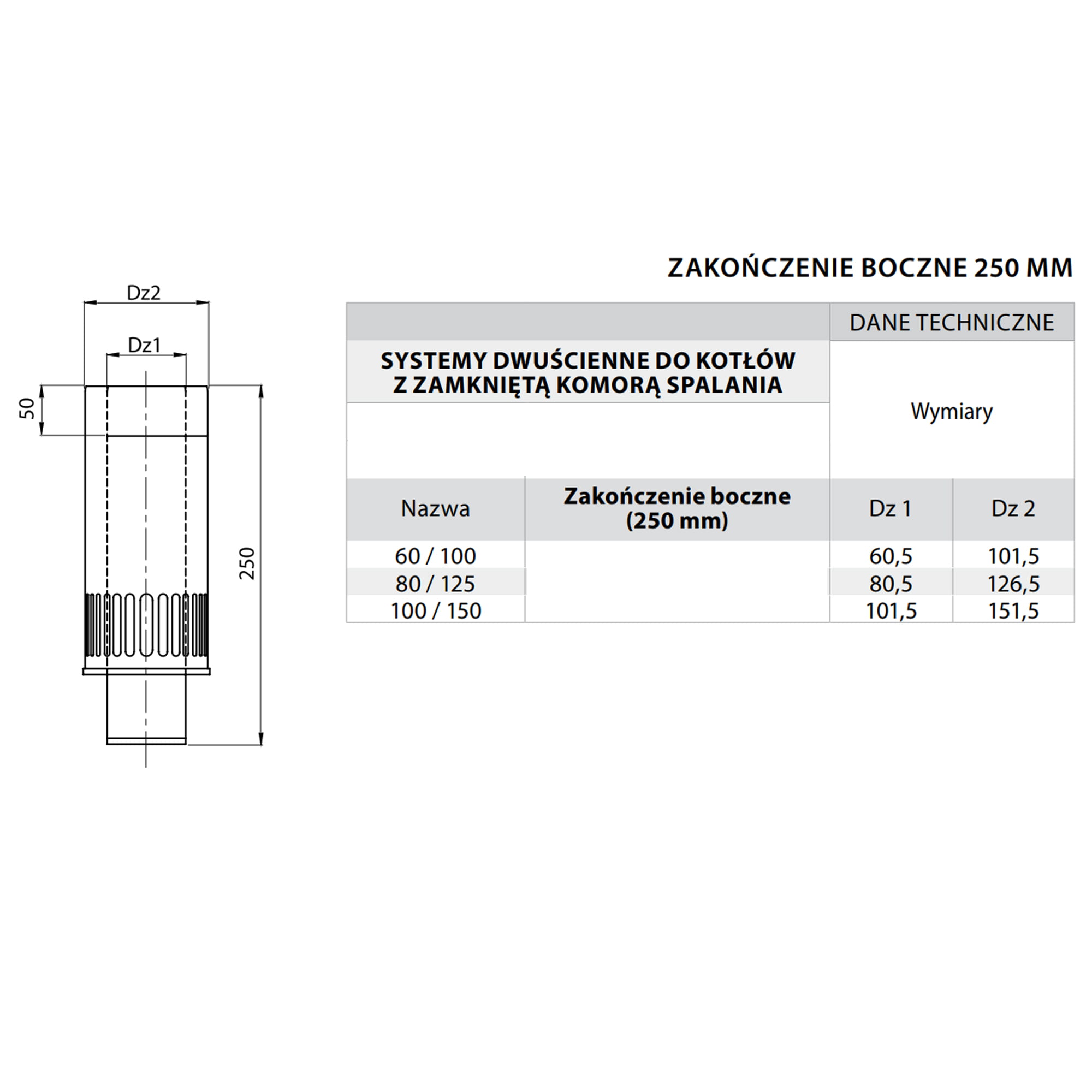 Zakończenie boczne wykonane z blachy kwasoodpornej przeznaczone jest do odprowadzania spalin w sytuacji gdy nie ma możliwości wyprowadzenie przewodu kominowego przez dach.