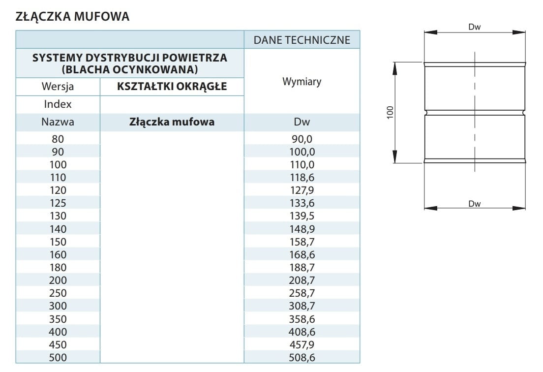 Złączka ocynkowana typu MUFA przeznaczona jest do łączenia ze sobą kształtek wentylacyjnych o przekroju okrągłym tej samej średnicy.